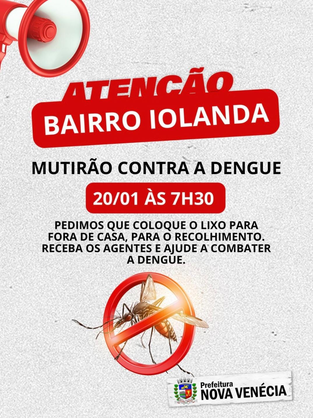 A Prefeitura de Nova Venécia realiza, terça-feira (20), a partir das 7h30, um mutirão de combate à dengue no bairro Iolanda. A ação integra as estratégias do município para intensificar a prevenção e reduzir os focos do mosquito Aedes aegypti, transmissor da dengue.