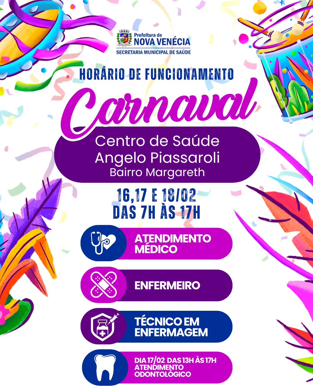 A Secretaria Municipal de Saúde de Nova Venécia divulgou o horário especial de funcionamento do Centro de Saúde Ângelo Piassaroli, localizado no bairro Margareth, durante o período de Carnaval. A unidade estará aberta nos dias 16, 17 e 18 de fevereiro, das 7h às 17h, garantindo atendimento à população mesmo durante o feriado prolongado.