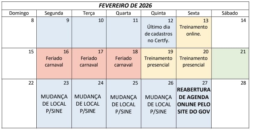 De acordo com o Instituto, no dia 13 de fevereiro haverá treinamento online obrigatório para as equipes, enquanto os dias 16, 17 e 18 serão considerados feriado e ponto facultativo de Carnaval. Já nos dias 19 e 20 ocorrerão treinamentos presenciais voltados à utilização do novo sistema de captura biométrica.
