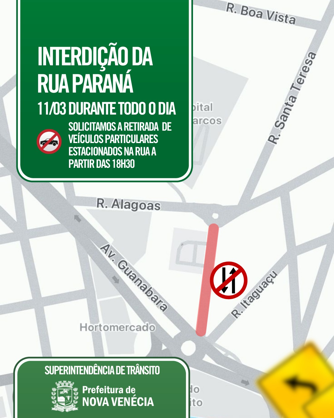 De acordo com o cronograma, a Rua Paraná será fechada para estacionamento de veículos nesta terça-feira (10), a partir das 18h30. Já na quarta-feira (11), a via ficará totalmente interditada para a execução da pavimentação asfáltica.