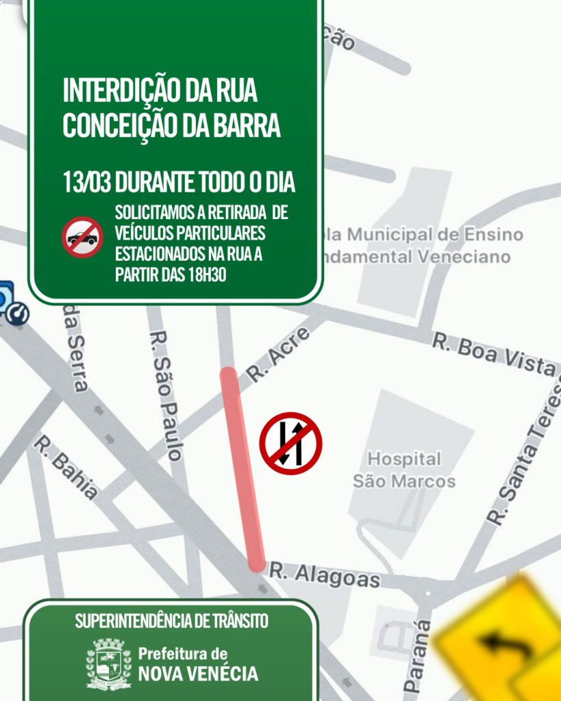 O cronograma continua em parte da Rua Conceição da Barra. A via será fechada para estacionamento na quinta-feira (12), a partir das 18h30, e na sexta-feira (13) ocorrerá a interdição para a execução dos serviços.