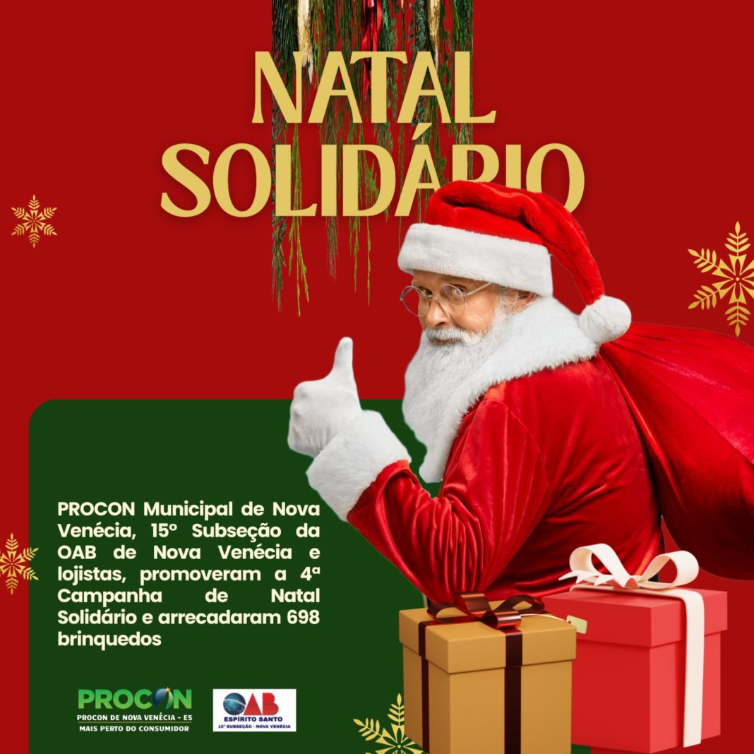 O PROCON Municipal de Nova Venécia–ES órgão vinculado a Secretária de Assistência Social, realizou, com grande sucesso, a 4ª Campanha de Natal Solidário, reafirmando seu compromisso social e a importância da união entre instituições públicas, privadas e a comunidade. A iniciativa contou com a parceria da OAB – 15ª Subseção de Nova Venécia, Óticas Novamatic, Economic Saúde, Rádio Nova Onda e Wizard, que juntos contribuíram para transformar o Natal de muitas crianças e famílias do município.