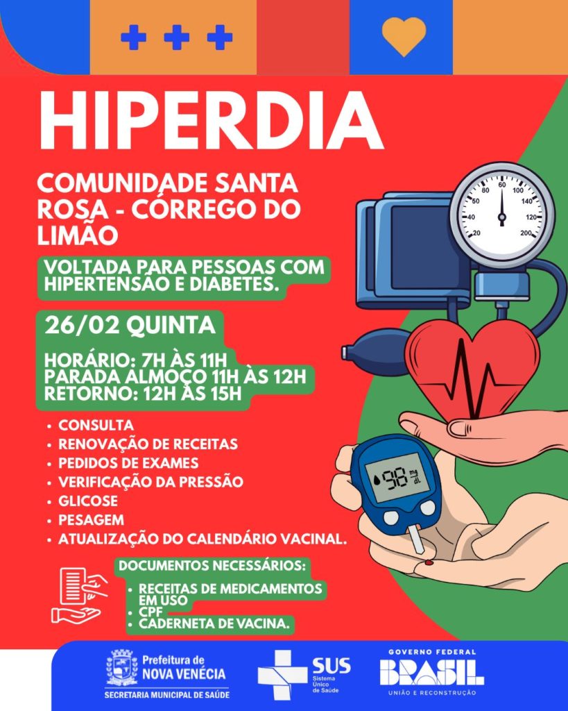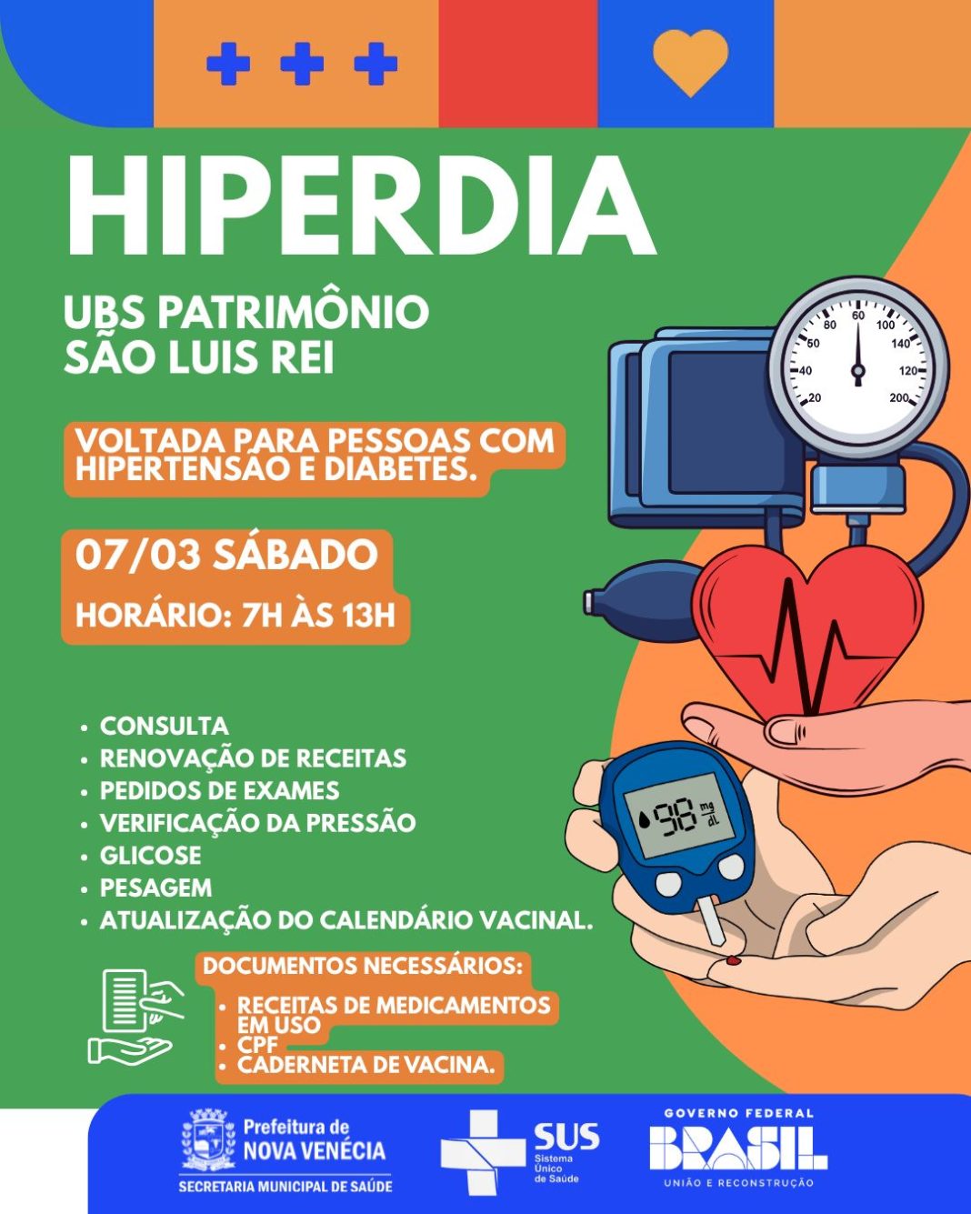 A Prefeitura de Nova Venécia, por meio da Secretaria Municipal de Saúde, realizará uma série de atendimentos do programa Hiperdia, voltados para pessoas com hipertensão e diabetes. As ações têm como objetivo acompanhar a saúde dos pacientes, promover a prevenção de complicações e garantir mais qualidade de vida à população.