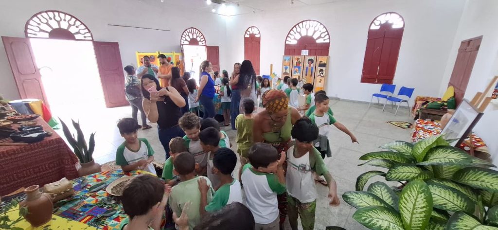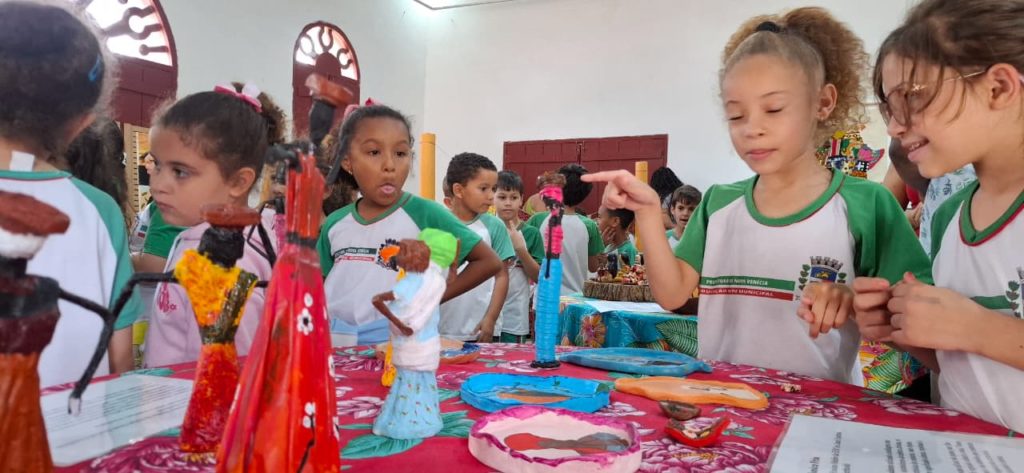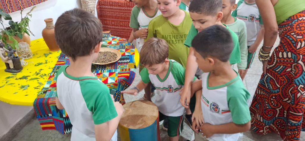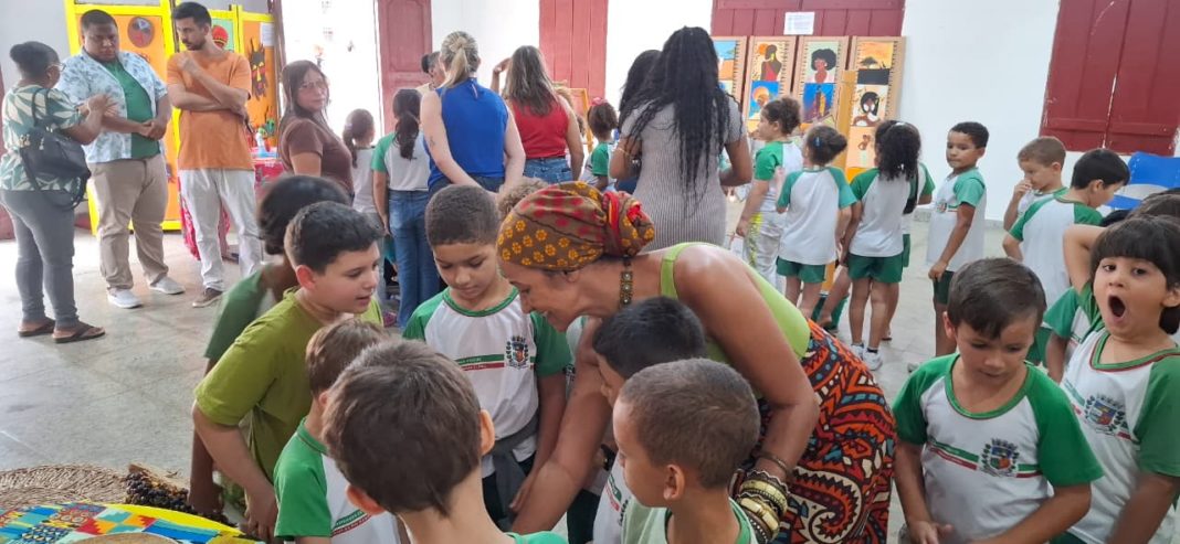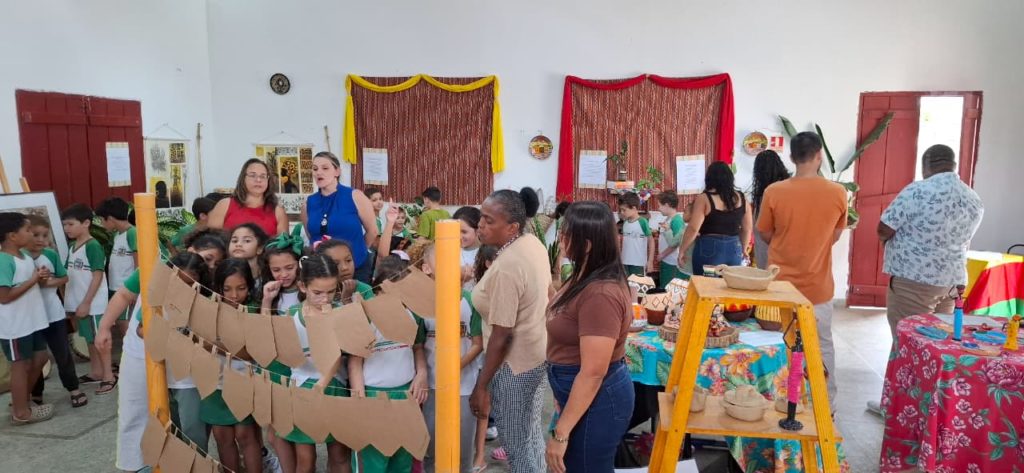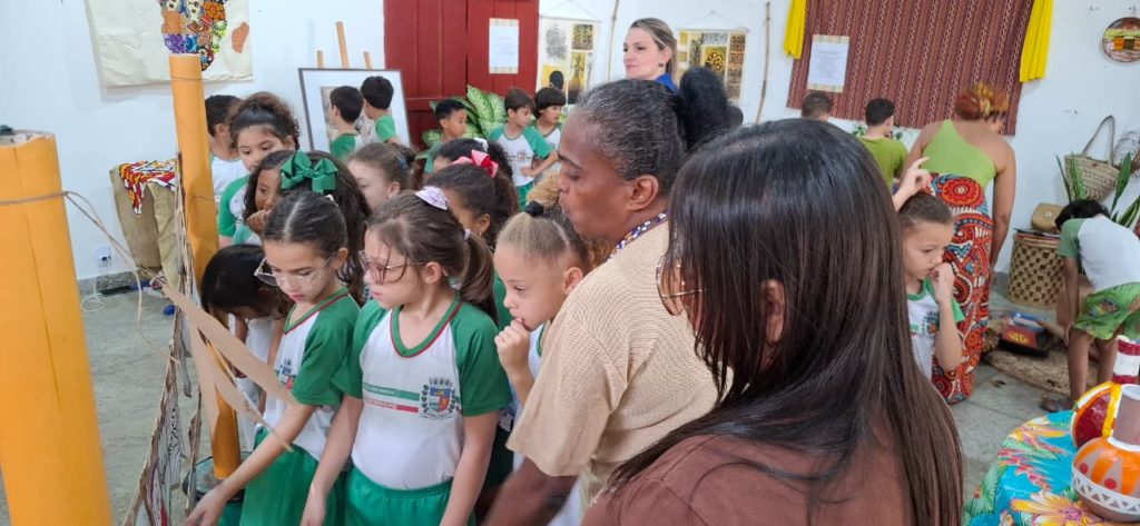 Outro destaque é a participação dos estudantes do município, que contribuíram com um varal de palavras de origem africana como angu, fubá, quitute e moleque, além de trabalhos sobre povos indígenas e africanos, reforçando a presença desses vocábulos e saberes na língua e na cultura brasileira.