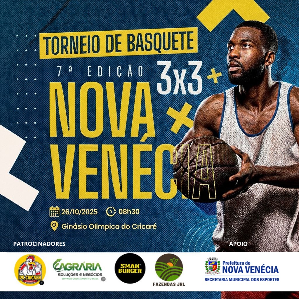 Neste domingo, dia 26 de outubro, acontece a 7ª edição do Torneio de Basquete 3×3 em Nova Venécia. O evento será realizado a partir das 8h30, no **Ginásio de Esportes, reunindo atletas apaixonados pela modalidade.