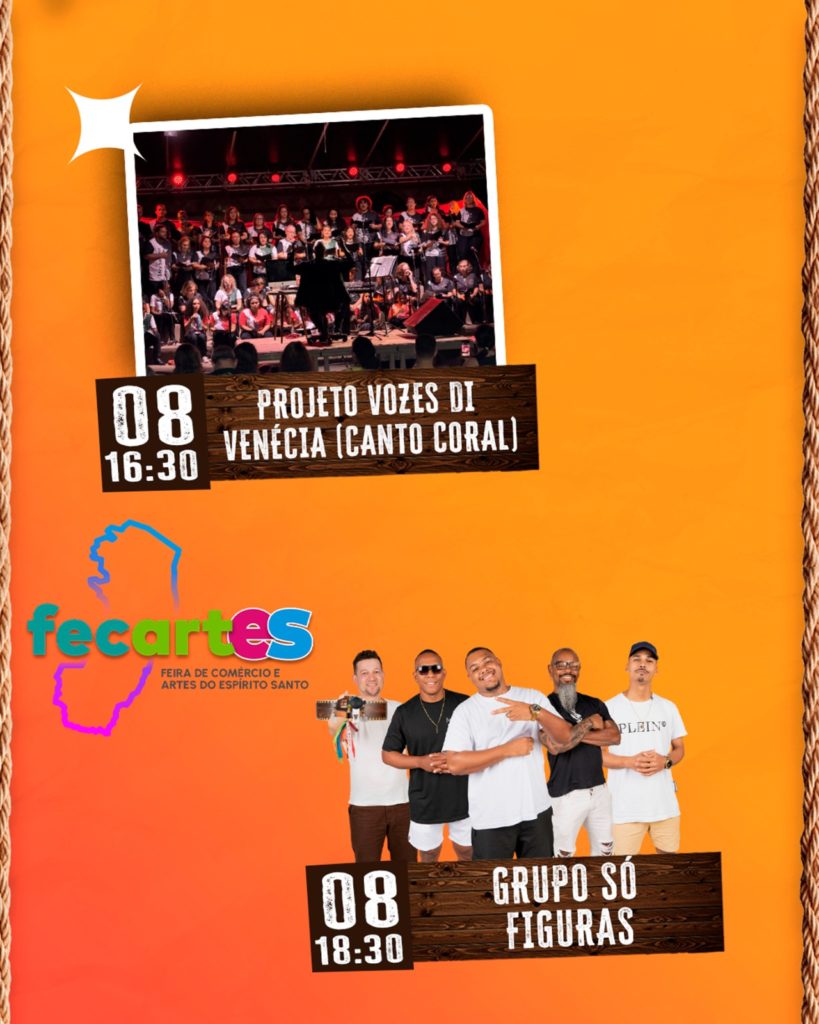 No domingo (8) a programação começa mais cedo com o projeto “Vozes Di Venécia” (Canto Coral) a partir das 16h30. Para fechar com chave de ouro, o grupo de pagode Só Figuras se apresenta a partir das 18h30.