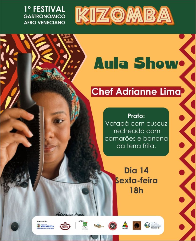 Na sexta-feira (14), às 18h, a Chef Adrianne Lima prepara o tradicional Vatapá com cuscuz recheado com camarões e banana-da-terra frita. Logo em seguida, às 19h, a Chef Kimberly retorna ao palco com o tema “Vivência Africana – Sabores e Saberes”, apresentando Bolinhos africanos de peixe e frango ao molho Chez Kimberly.
