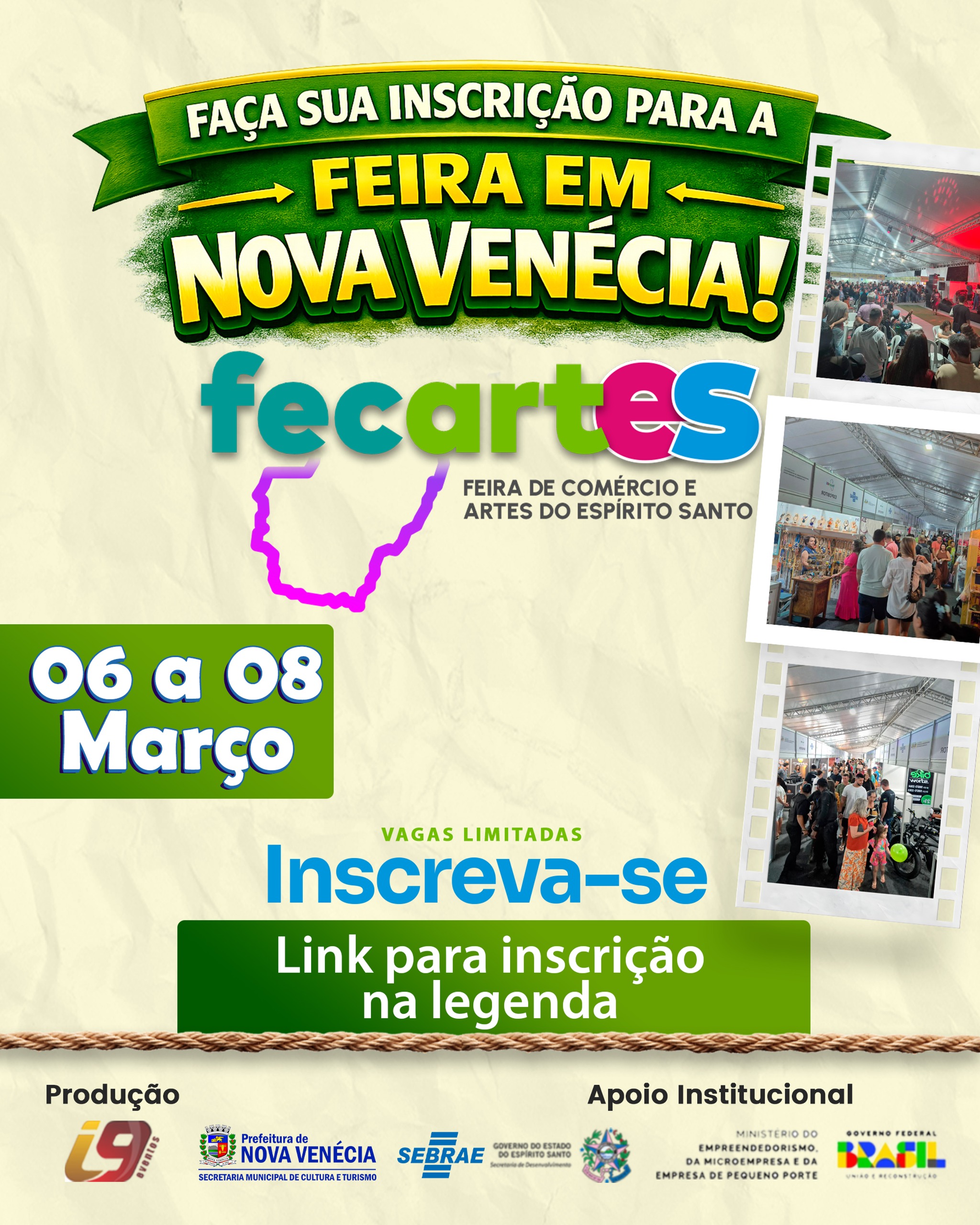 Empreendedores, artesãos e comerciantes já podem garantir participação na FecartES – Feira de Comércio e Artes do Espírito Santo, que acontecerá entre os dias 06 e 08 de março, na Praça Ivo Lobo, em Nova Venécia. O evento reunirá cultura, negócios e empreendedores, conectando talentos e incentivando o empreendedorismo, além de juntar arte, gastronomia, música e muita diversão para as crianças.