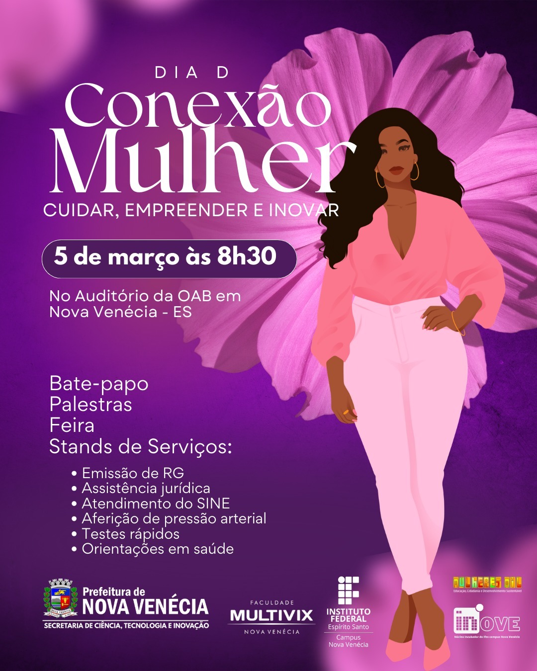 A Prefeitura de Nova Venécia, por meio da Secretaria Municipal de Ciência, Tecnologia e Inovação, convida todas as mulheres venecianas para participar da Conexão Mulher, evento especial em homenagem ao Dia Internacional da Mulher.