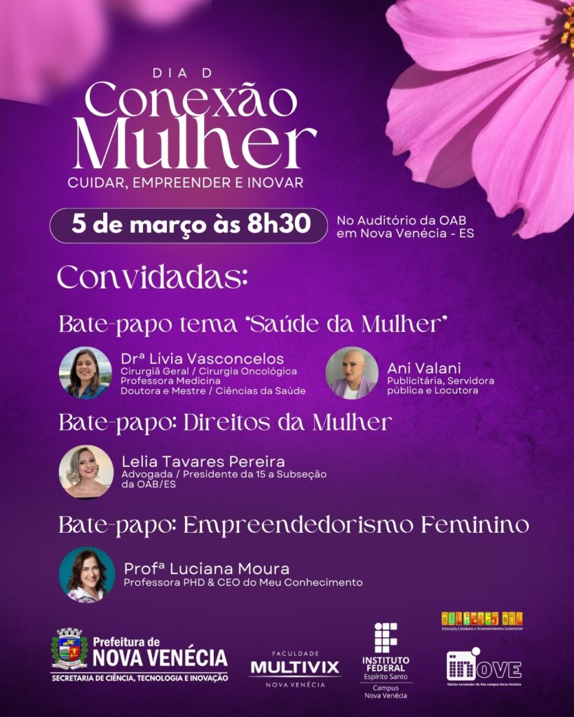 A programação contará com bate-papos e palestras com a participação da professora de Medicina, Drª Lívia Vasconcelos; da publicitária e servidora pública, Ani Valani; da presidente da OAB em Nova Venécia, advogada Lélia Tavares Pereira; e da professora PHD e CEO, Luciana Moura. As convidadas vão compartilhar experiências e conhecimentos voltados ao cuidado com a saúde, ao protagonismo feminino e às oportunidades no universo da inovação.