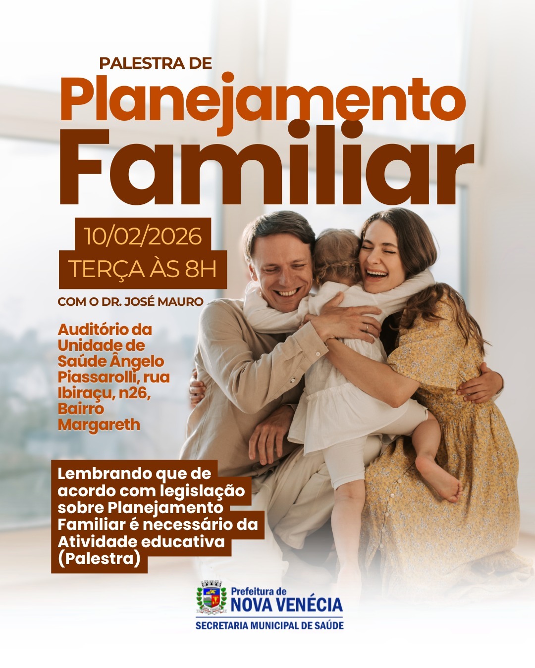 A Secretaria Municipal de Saúde de Nova Venécia realiza, na próxima terça-feira, dia 10 de fevereiro de 2026, uma Palestra de Planejamento Familiar, voltada à orientação e educação da população sobre o tema. A atividade acontece às 8 horas da manhã, no auditório da Unidade de Saúde Ângelo Piassarolli, localizada na Rua Ibiraçu, nº 26, no bairro Margareth.