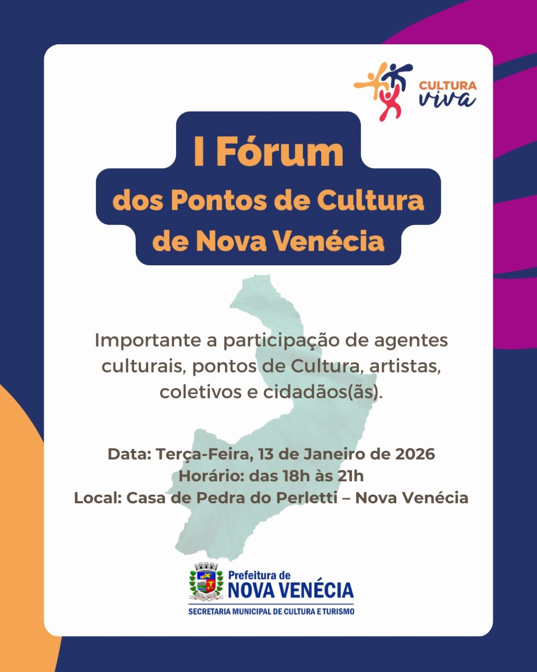 A Prefeitura de Nova Venécia, por meio da Secretaria Municipal de Cultura e Turismo (SECTUR-NV), promove na próxima terça-feira, dia 13 de janeiro, o I Fórum dos Pontos de Cultura de Nova Venécia. O evento será realizado das 18h às 21h, na Casa de Pedra do Perletti, e é aberto a agentes culturais, artistas, coletivos, representantes de pontos de cultura e cidadãos interessados.