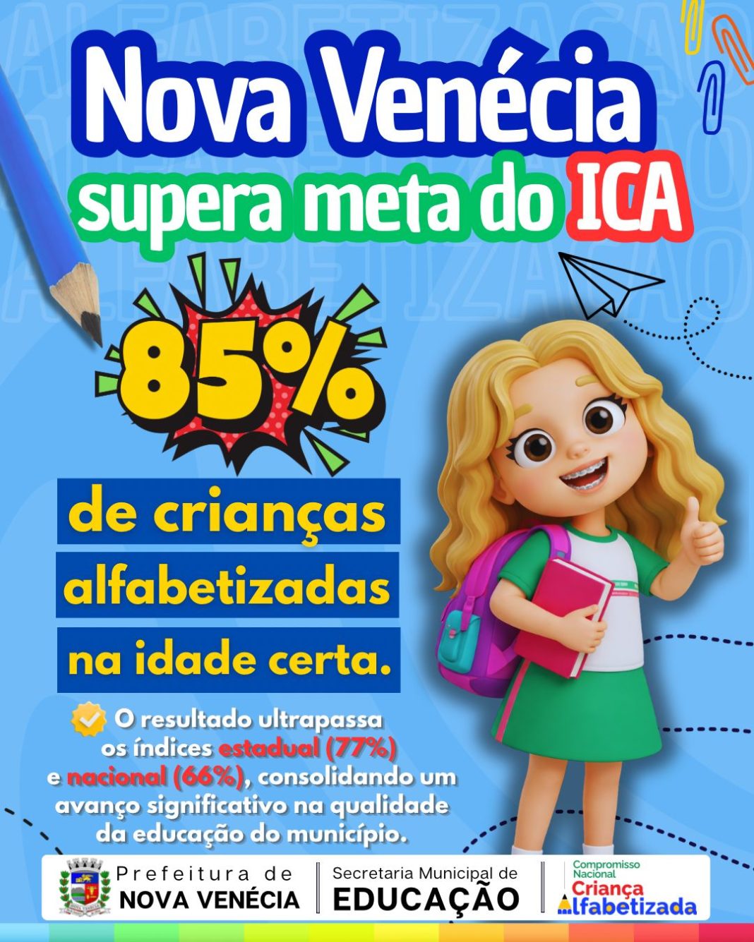 O município de Nova Venécia alcançou o índice de 85% de crianças alfabetizadas na idade certa em 2025, superando a meta prevista e consolidando avanços significativos na educação básica. Os dados fazem parte do Indicador Criança Alfabetizada (ICA), iniciativa vinculada ao Instituto Nacional de Estudos e Pesquisas Educacionais Anísio Teixeira.