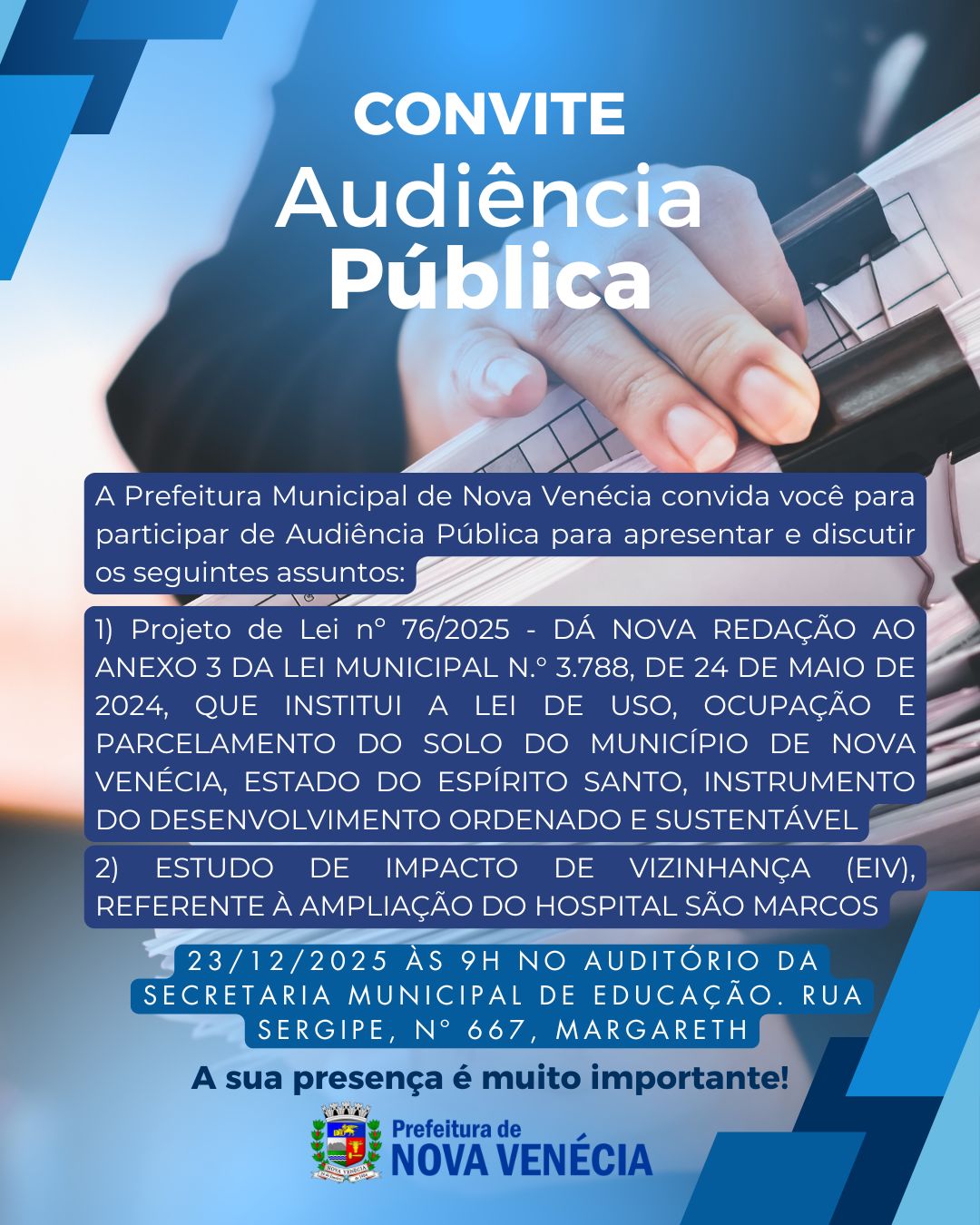 A Prefeitura de Nova Venécia, por meio da Secretaria Municipal de Planejamento, promoverá uma Audiência Pública na próxima terça-feira (23), a partir das 9h, com o objetivo de apresentar e discutir temas relevantes para o desenvolvimento urbano do município. O encontro será realizado no Auditório da Secretaria Municipal de Educação, localizado na Rua Sergipe, nº 667, bairro Margareth.