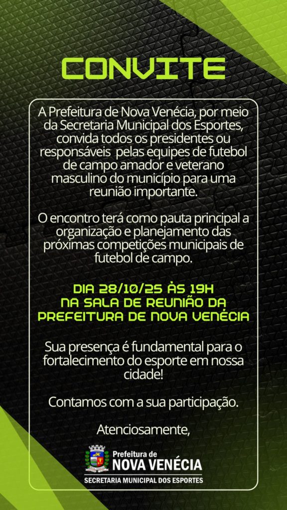 A Secretaria Municipal dos Esportes de Nova Venécia convida todos os representantes das equipes de futebol amador e veterano, bem como das equipes de futsal masculino adulto, veterano e feminino, para participarem de uma reunião que discutirá a organização e o planejamento das próximas competições esportivas do município.