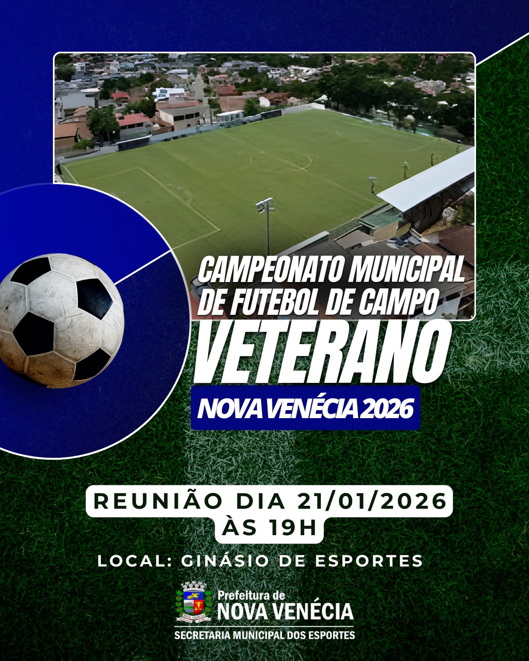 A Prefeitura de Nova Venécia, por meio da Secretaria Municipal dos Esportes, convida todas as equipes veteranas interessadas a participarem da reunião, contribuindo com sugestões para a consolidação do novo projeto esportivo.
