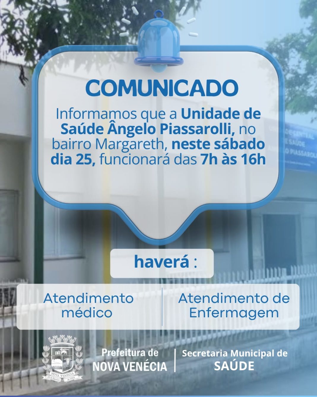 A Prefeitura de Nova Venécia, por meio da Secretaria Municipal de Saúde, informa que a Unidade de Saúde Ângelo Piassarolli terá funcionamento especial neste sábado, dia 25.
